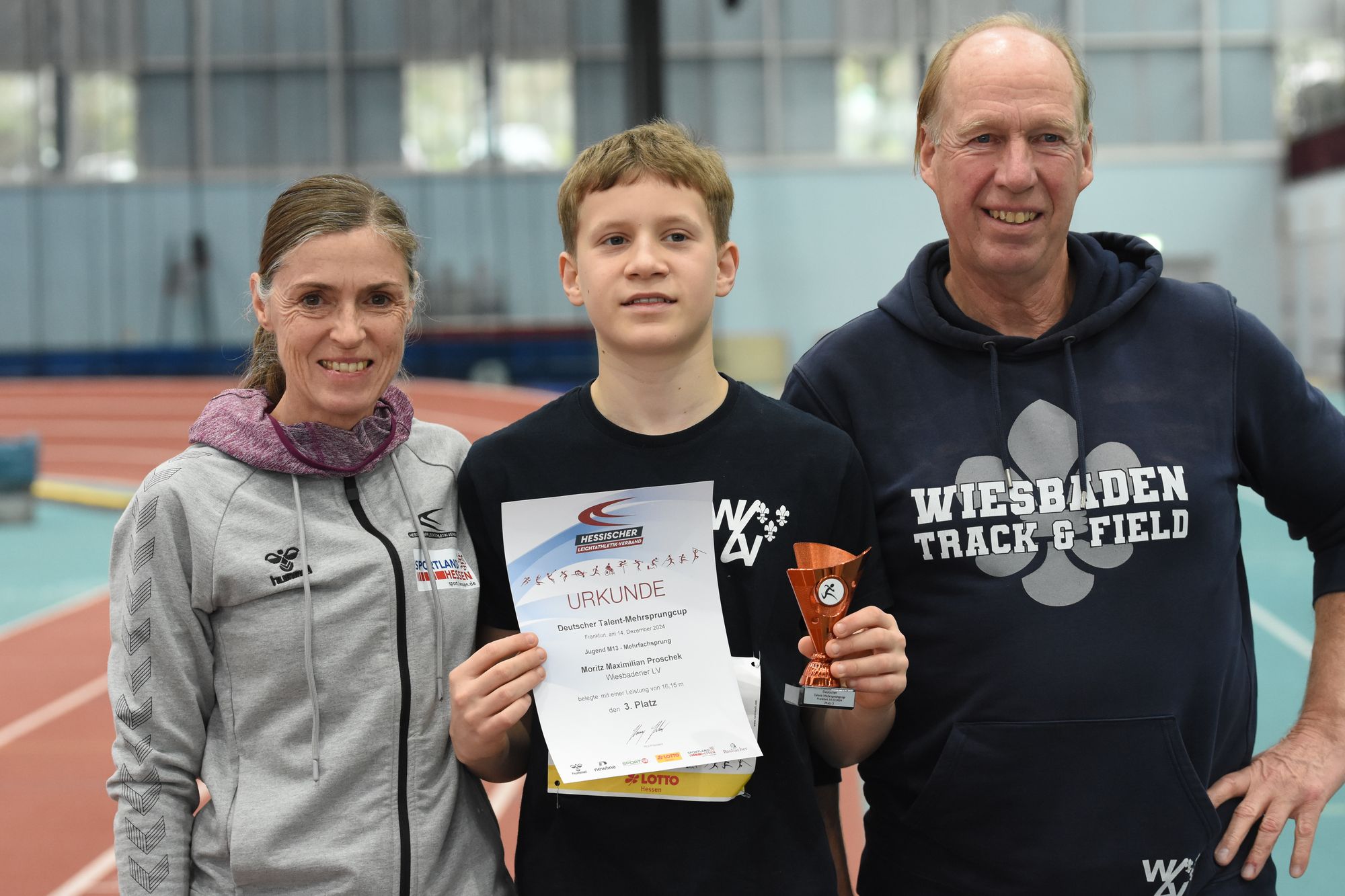 In der M13 überzeugte Moritz Maximilian Proschek (Wiesbadener LV) mit einer klasse Serie mit allen Sprüngen über der 16-Meter-Marke.16,15m im letzten Sprung brachten ihm den Bronzerang.