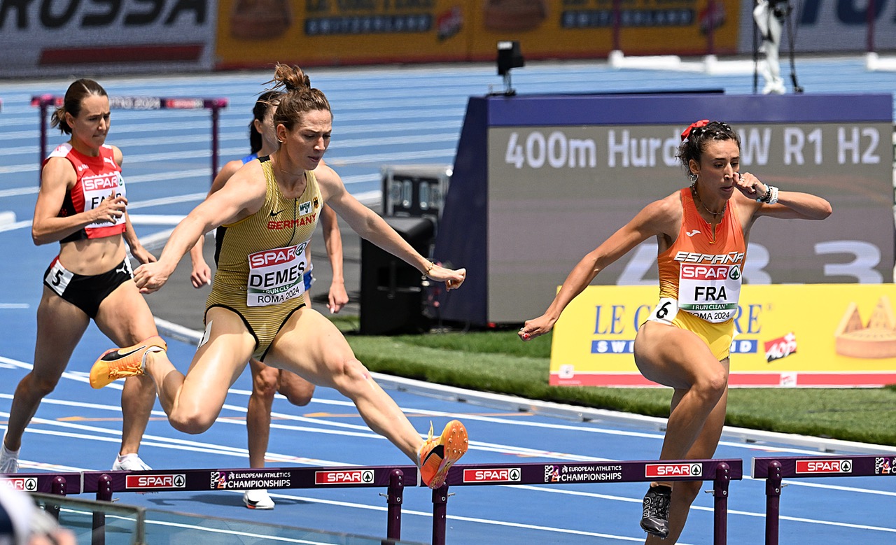 Sehr souverän hingegen spulte Eileen Demes ihr Rennen über 400m Hürden ab. In einem klasse Rennen und mit neuer persönlicher Bestleistung von 55,25 sek. gewann Demes ihren Lauf und zieht als Zweitschnellste der Vorläufe in die Halbfinals am Montag ein.