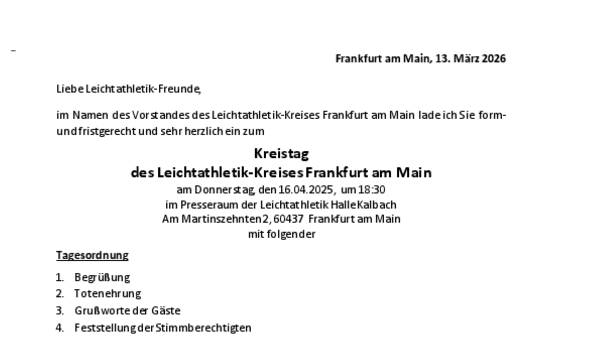 hiermit lade ich Sie herzlich zum diesjährigen Kreistag des Leichtathletik Kreises Frankfurt am Main am 16.04.2026 18:30 ein.